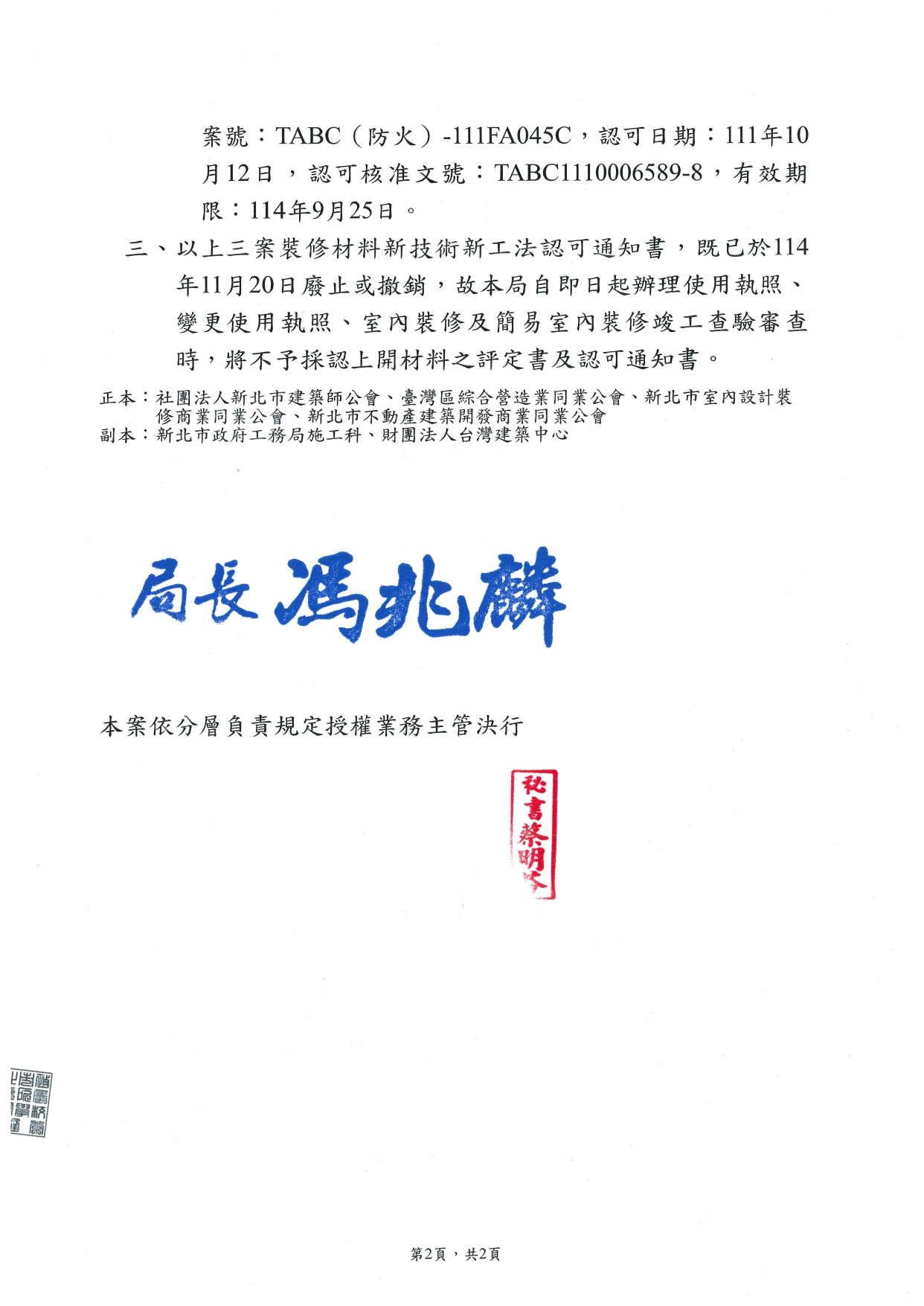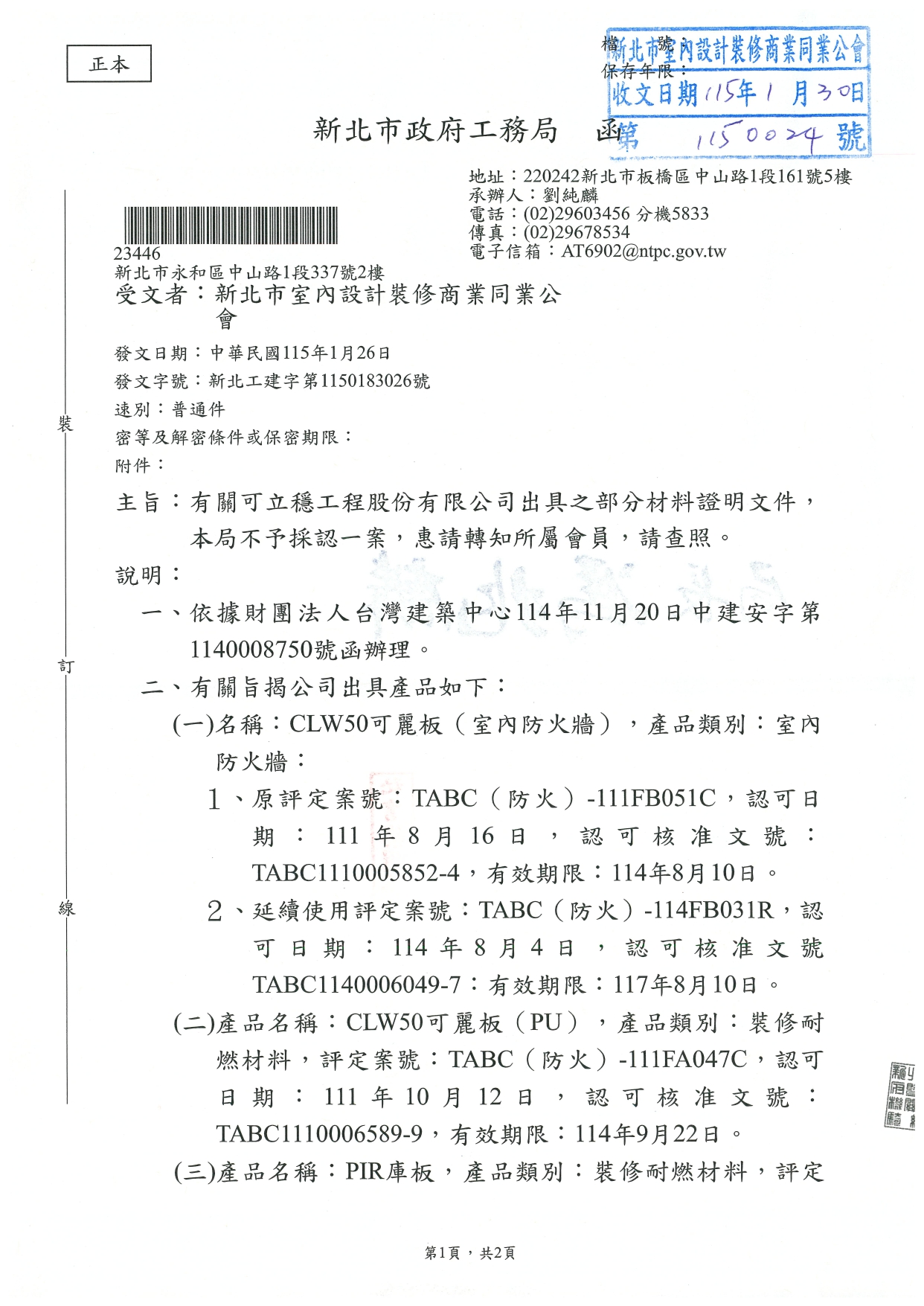 【轉知公文】新北市政府工務局▶有關可立穩工程股份有限公司出具之部分材料證明文件,本局不予採認一案