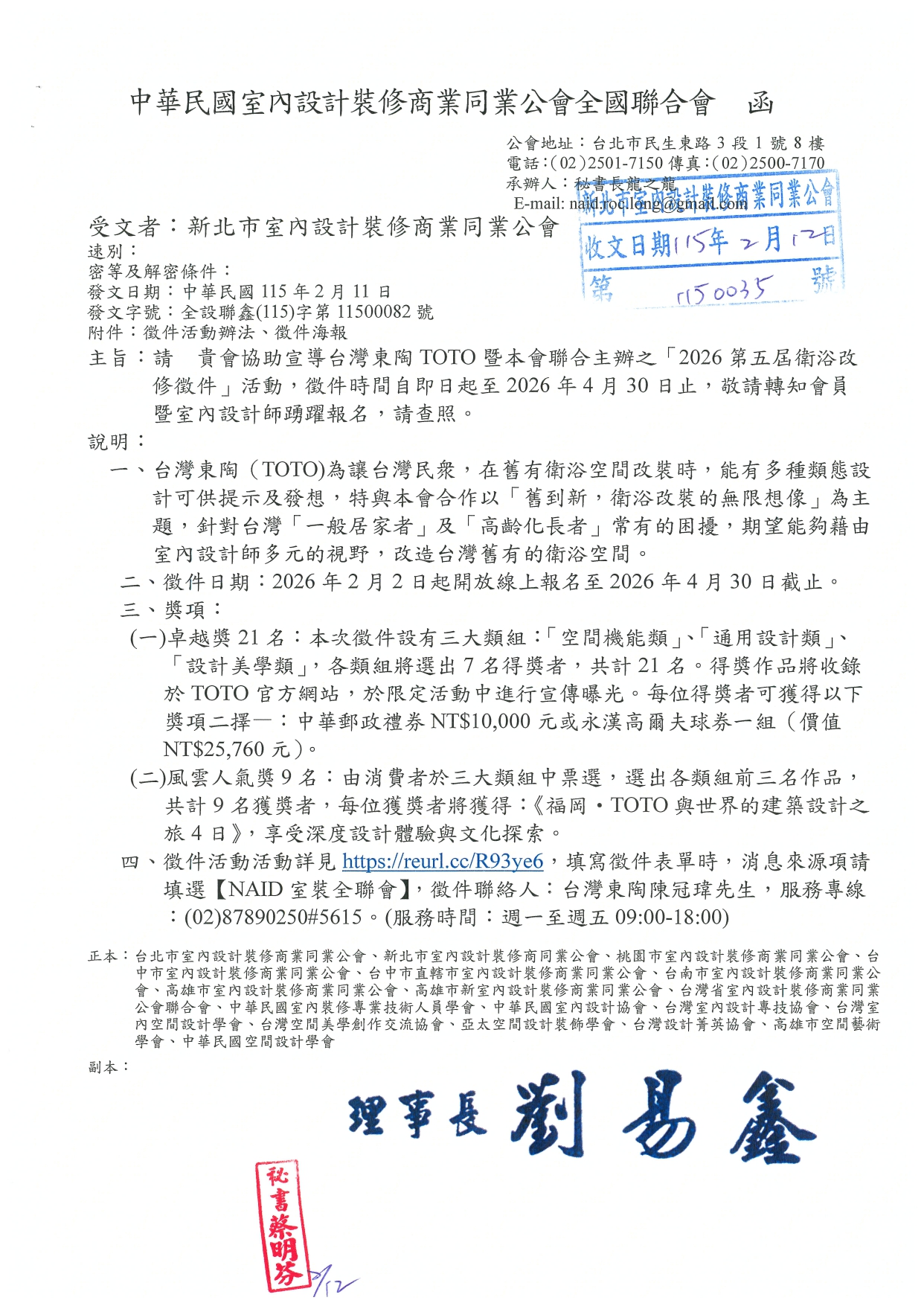2026-02-12 【轉知公文】中華民國室內裝修全國聯合會▶協助宣導台灣東陶TOTO暨本會聯合主辦之2026第五屆衛浴改修徵件 TOTO暨全聯會聯合主辦之2026第五屆衛浴改修徵件(附件)_compressed 回上一頁